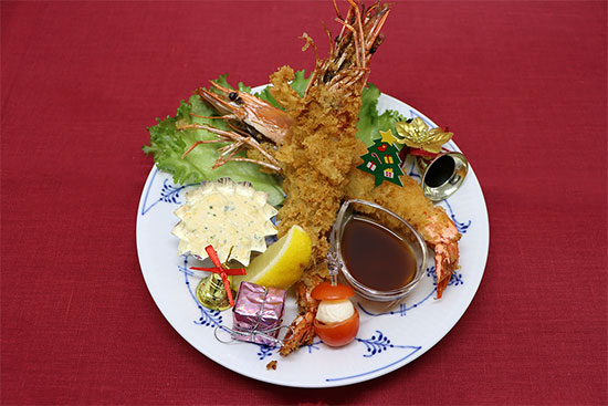 見た目で歓声が上がるのは、大きな有頭海老フライです。