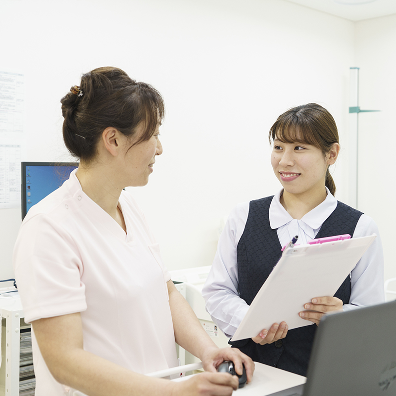 受付業務では、窓口業務・患者様登録・カルテ作成・処方箋の確認・お会計を主にしています。事務業務では、入院費の概算・保険やその他請求などを行なっています。